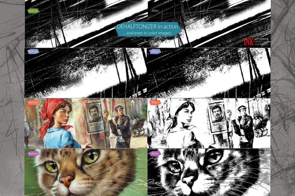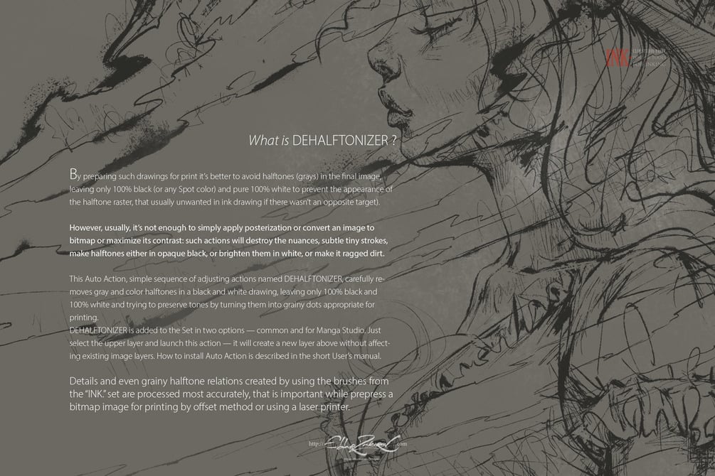 • 2. DEHALFTONIZER Auto Action, in two options: common DEHALFTONIZER, Hard INK Drawing.laf and option for old versions (Manga Studio) — DEHALFTONIZER, Hard INK Drawing-for Manga Studio.laf.