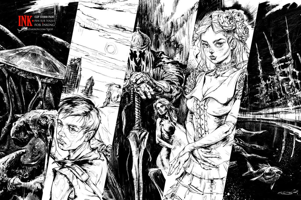 When I started working on a number of graphic illustrations in Clip Studio Paint, I needed to transfer into CSP all "INK." brushes I made during about two years of work earlier for Photoshop. You know that CSP and Photoshop are pretty different software with rather dissimilar settings, but finally, during work on a number of new graphic art pieces, I reached my goal and got the sub tools for CSP that work similarly and maybe even better than I made for Photoshop previously.