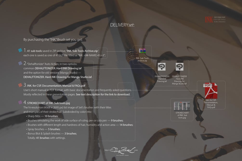 • 1. 41 sub tools saved in ZIP-archive “INK. Sub Tools Archive.zip” are saved as one of 41 SUT files titled “INK. <##-NAME>©.sut”;