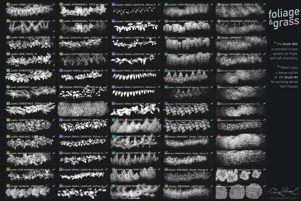 Designed to assist digital painters, concept artists, and designers in depicting forests, leaves, trees, grass, and mosses, and save your time.
