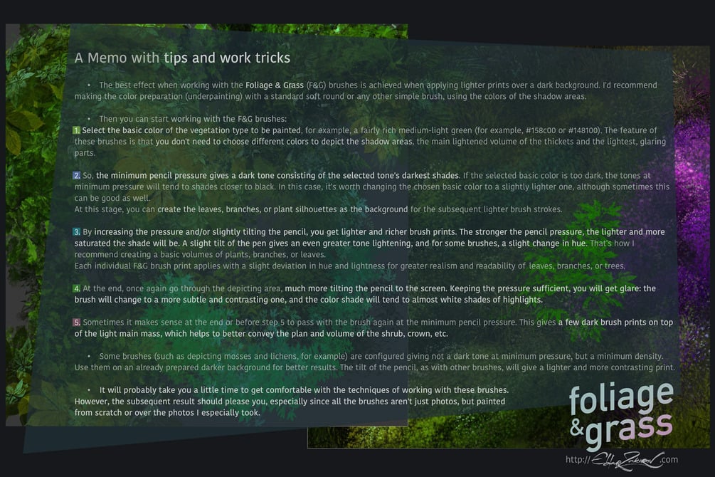 - • Memo pictures — a set of images with a brief description of the brushes' features and working techniques with them. These are the pics you've seen above; here they're just to have them handy as a memo.